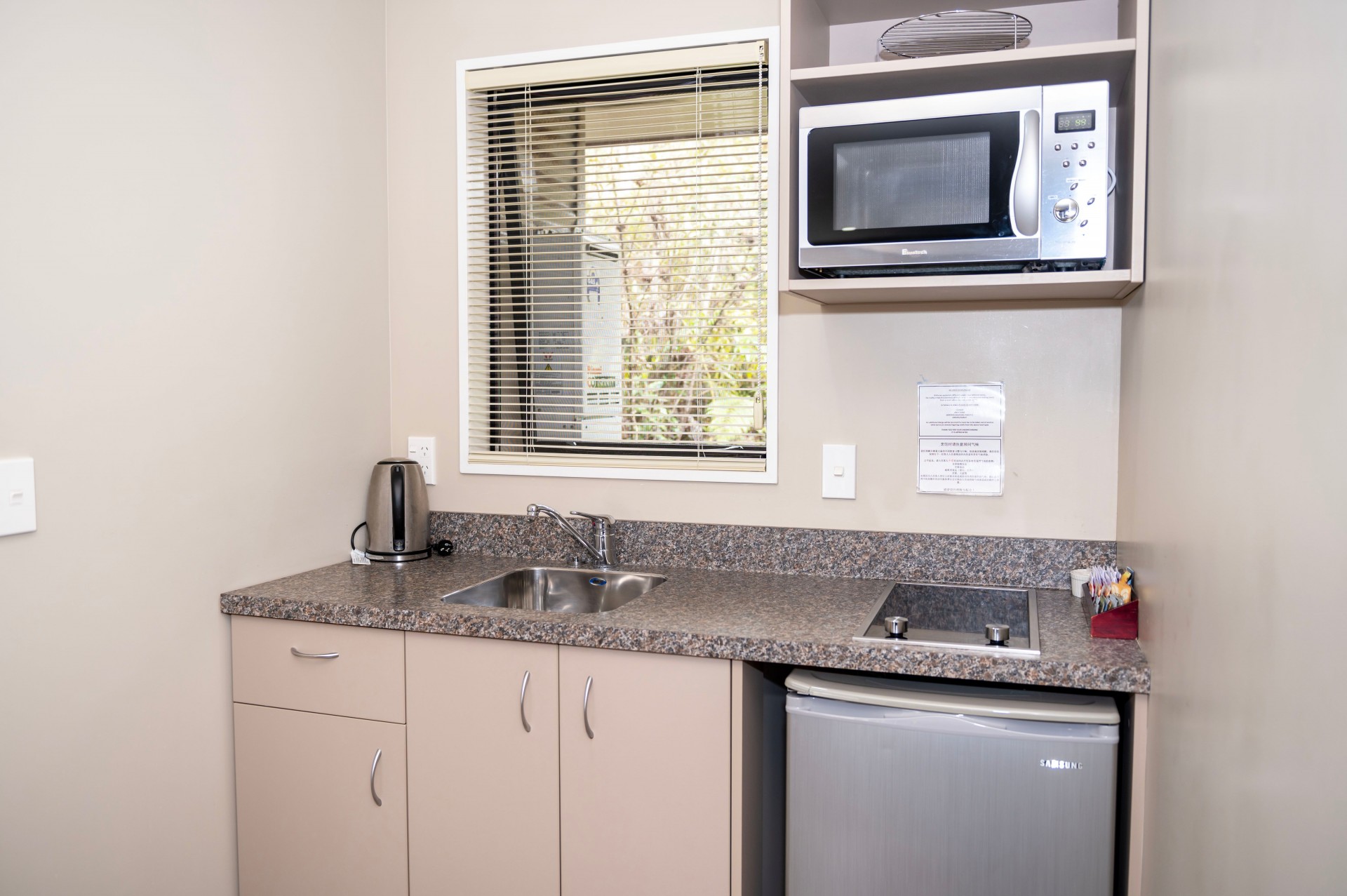 - Kitchenette with fridge, hotplates, microwave, electric kettle, toaster, crockery and utensils.