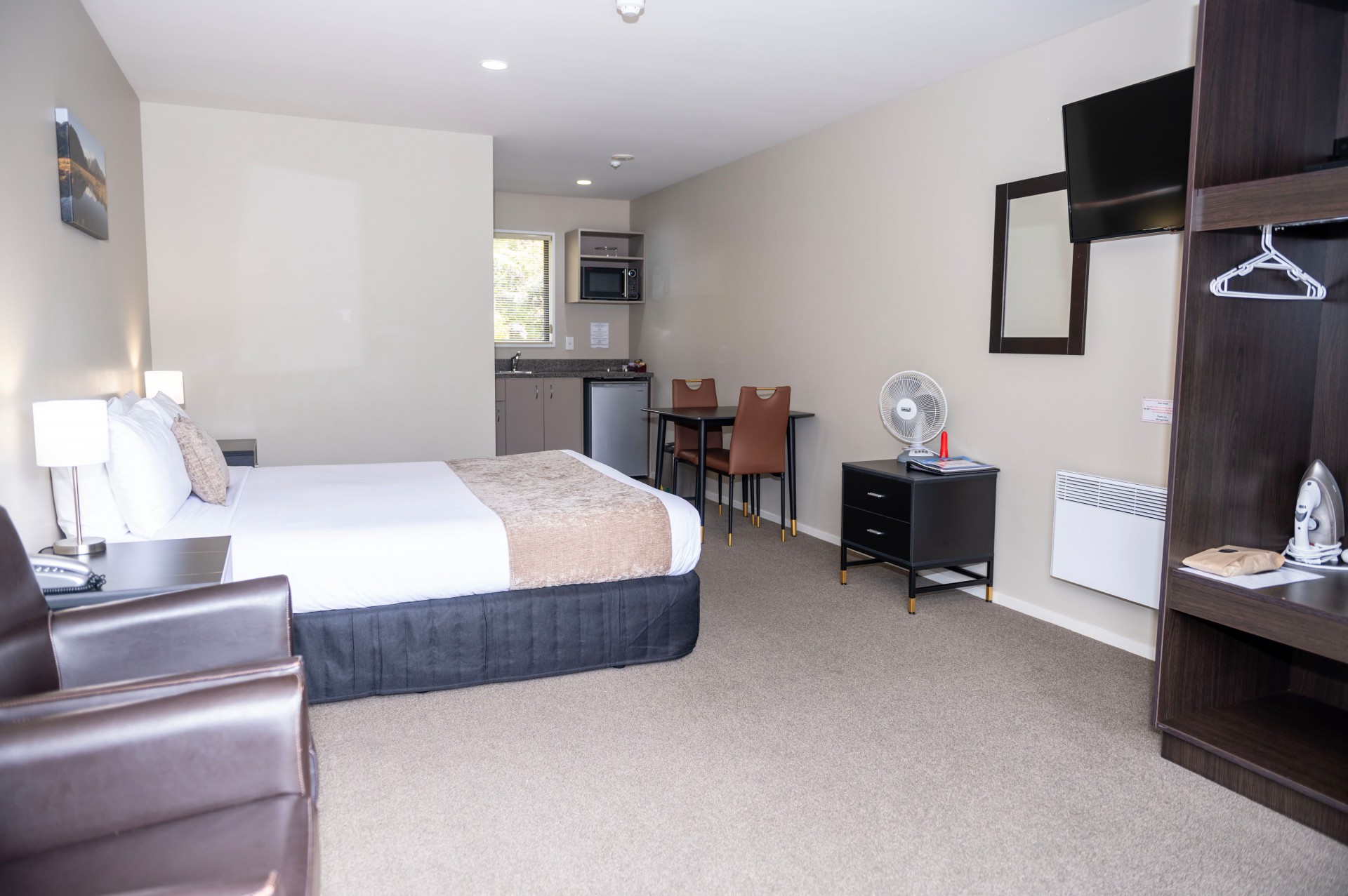 - Kitchenette with fridge, hotplates, microwave, electric kettle, toaster, crockery, and utensils.